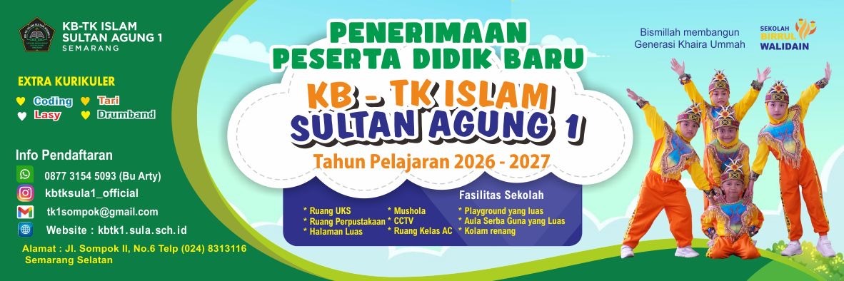 TK Islam Sultan Agung 1 merupakan salah satu unit sekolah di bawah naungan Yayasan badan Wakaf Sultan Agung (YBWSA). Sekolah kami mengusung konsep Pendidikan Islami yang mengedepankan nilai akhlak mulia, pembelajaran berbasis karakter, serta pendekatan ramah anak yang dirancang untuk mengembangkan potensi anak secara holistik. Kami berkomitmen untuk Membangun Generasi Khaira Ummah yang berkarakter Birrul Walidain, yaitu generasi terbaik yang menghormati dan berbakti kepada orang tua dan guru serta memiliki kepedulian sosial yang tinggi, tempat siswa diajarkan untuk menjadi individu yang berakhlak mulia, cerdas, dan peduli terhadap sesama.